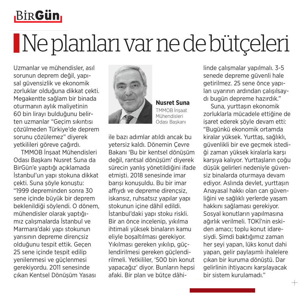 İMO Yönetim Kurulu Başkanı Nusret Suna, 500 bin konut projesi hakkında Birgün Gazetesine açıklamalarda bulundu.